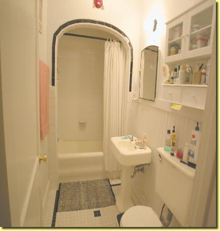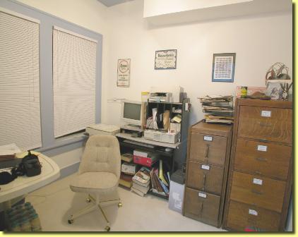 Quaint bathroom (left) has full tub & shower with tile walls and floor. There is an antique cast iron sink and commode, as well as a small linen closet, two medicine cabinets and a lighted vanity mirror. Above is the small study, which is off the kitchen, has a ceiling fan and two large windows which look out upon the balcony and backyard/pool area. | ||||||||||||||