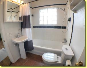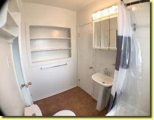 Bathroom features pedestal sink with mirrored medicine cabinet and four cosmetic lights. A tub/shower, new commode and pedestal sink in 2016. Walls and floor are ceramic tile. A large medicine cabinet, a small shelf and a much larger built-in shelf is available. | ||||||||||||||