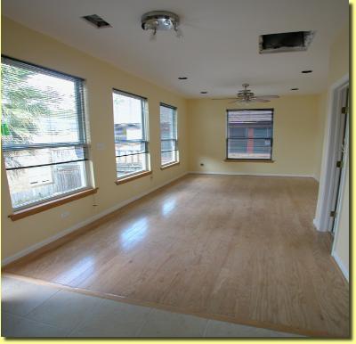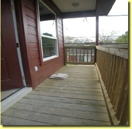 Dining room is between the living room and kitchen. There is a small porch outside the front door which can be seen, too.
